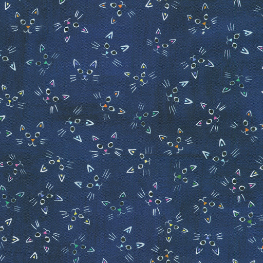 Robert KaufmanCat faces against a dark blue background. Meow! Whisker Wonderland by Subhashini Narayanan for Robert Kaufman Fabrics is full of mischief and ennui...