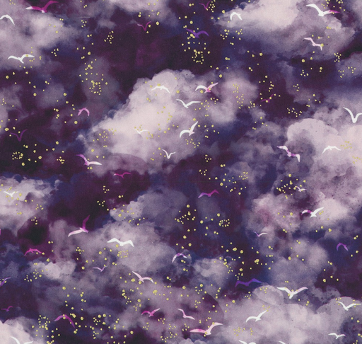 Robert KaufmanPurple skies with flying birds accented with gold metallic. Hill Shine by Rose Halsey for Robert Kaufman fabrics is a metallic line full of beautif...