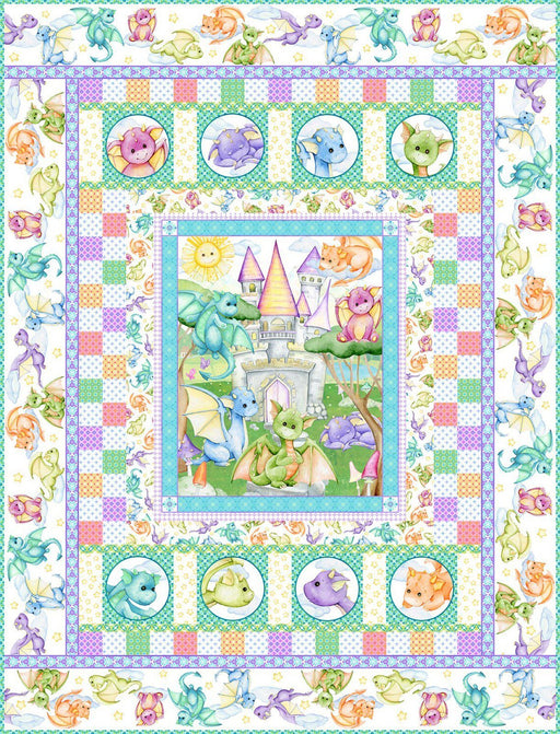 In the Beginning FabricsTossed dragons on a white background. Dragon Friends by In the Beginning Fabrics is bursting with kid-friendly colors, playful dragons, and whimsic...
