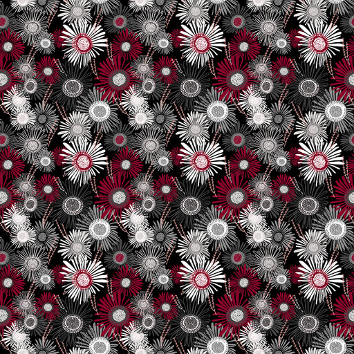 ClothworksBlack background with scattered crazy daisies. Merlot by Clothworks designer Teresa Magnusen shows off the elegance of black, white and dark red. S...
