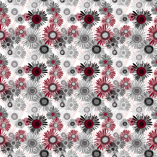 ClothworksWhite background with scattered crazy daisies. Merlot by Clothworks designer Teresa Magnusen shows off the elegance of black, white and dark red. S...