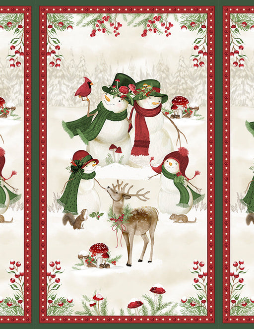 Wilmington Prints24" panel with a happy snowman family. Woodland Snowmen by Wilmington Prints is a classic winter line; complete with smiling snowmen and beautiful ...