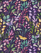 Print showing a purple background with purple, pink, yellow and teal leaves and flowers growing. Wilmington Prints and Lola Molina present Botanical Magic, a line of mystical colors, butterflies and plants, plus more than a hint of magic.