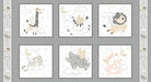 24" panel showing grouped animals in soft grays and yellow in six 10" squares. Introducing "Moonlit Dreams" by Victoria Hutto for Studio E Fabrics—a whimsical collection designed to lull your little ones into a serene slumber. Featuring adorable baby animals like elephants, lions, and giraffes soaring through starlit skies and fluffy clouds. This range offers a soothing neutral palette that complements any nursery décor. Perfect for crafting cozy quilts and cherished keepsakes, "Moonlit Dreams" brings a touch of magic to every stitch.